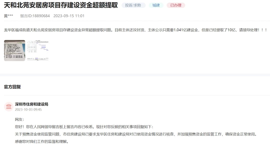 龙华区住房和建设局称,“下一步,我局将加强与市住建局和银行沟通协调,尽快将天和北苑项目预售款资金账户纳入行政监管范围,严格监督开发企业专款专用。”